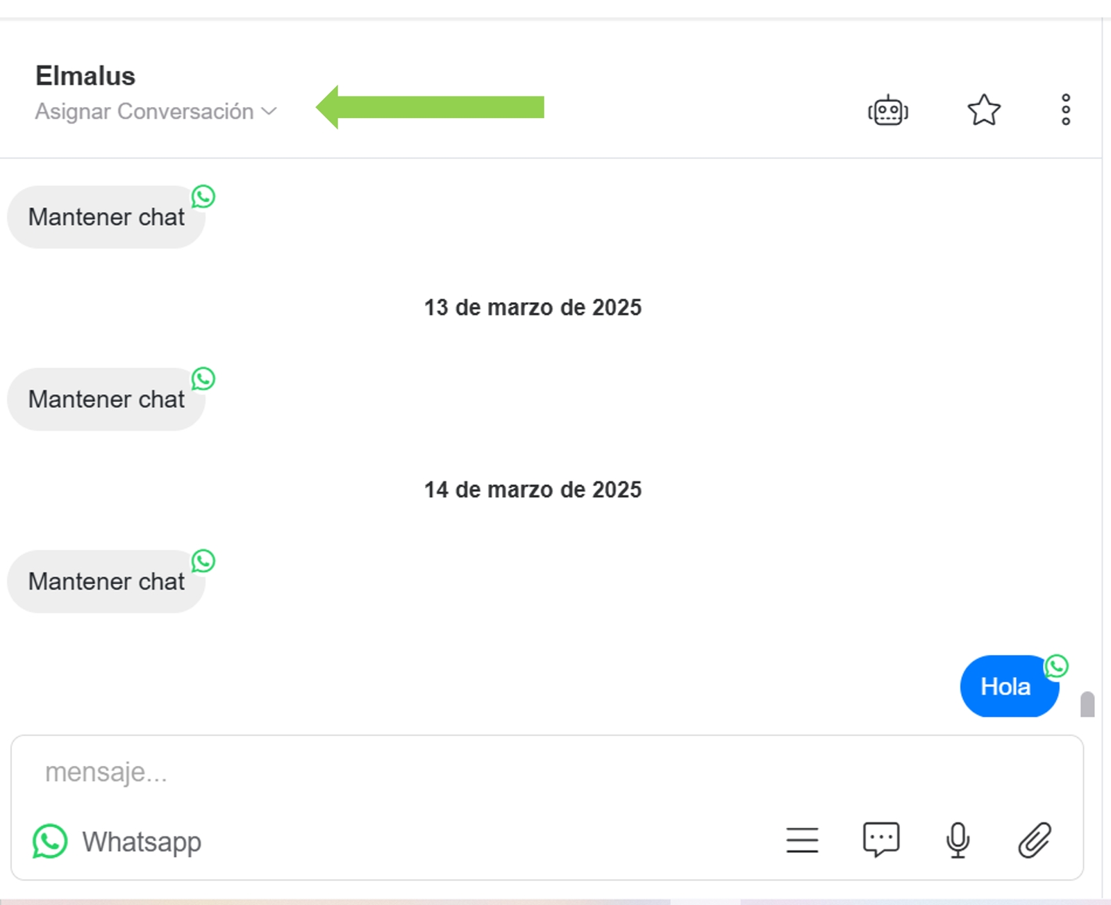 Abre la conversación que quieres asignar >> Pulsa la opción Asignar conversación y elige el administrador al que deseas reasignarla.