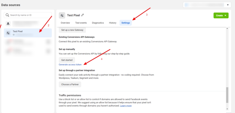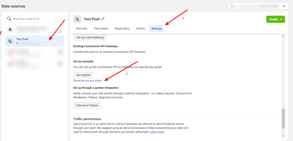 Accede a Administrador de eventos > Fuentes de datos > selecciona la configuración del píxel > y desplázate hasta el botón Generar token de acceso. Emplearás el token generado en el paso siguiente.