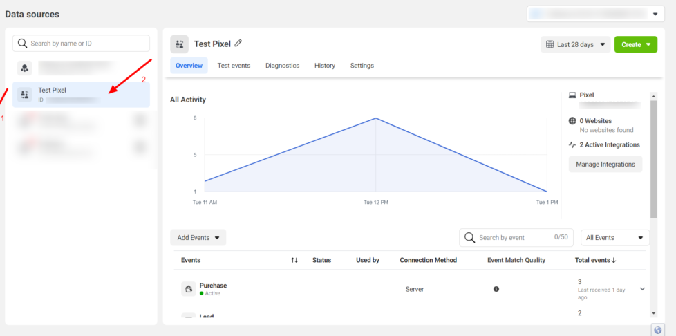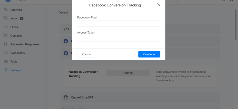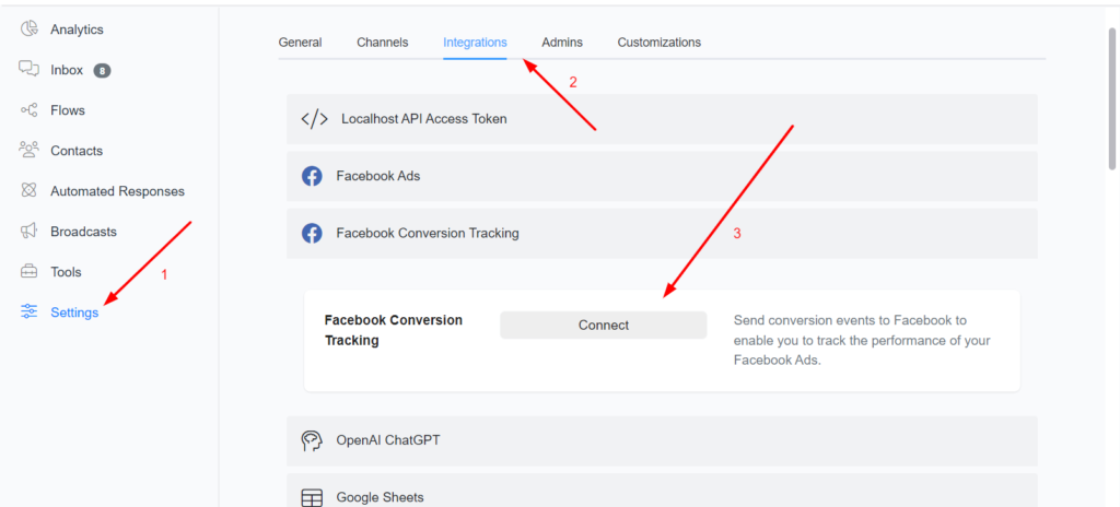 Ve a Configuración > Integraciones > seguimiento de conversiones de Facebook