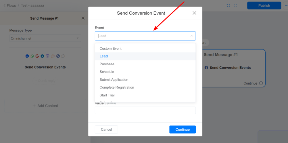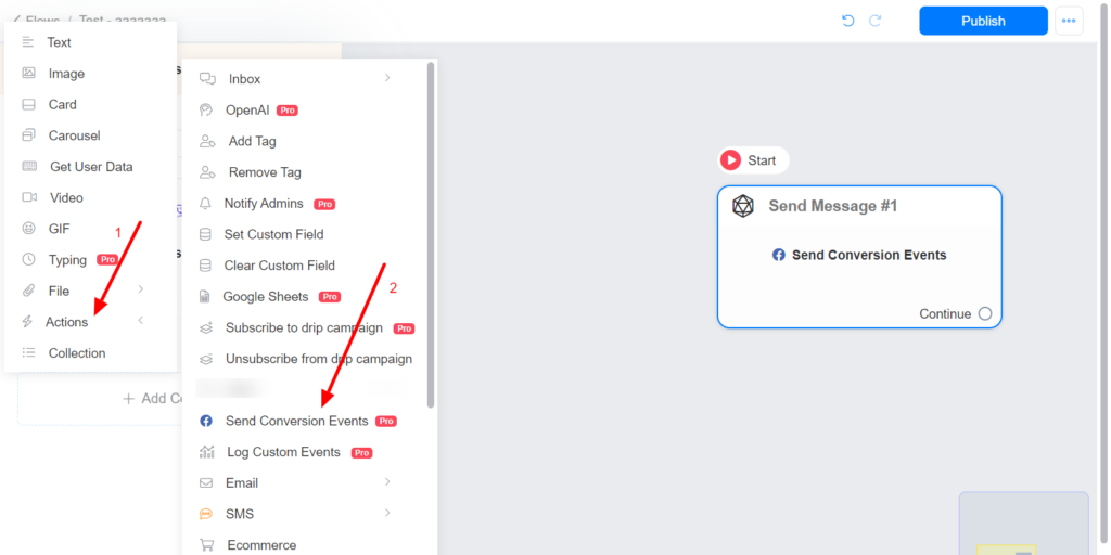 Debes usar Acciones > Enviar evento de conversión en Flow para remitir los eventos de conversión a Facebook.