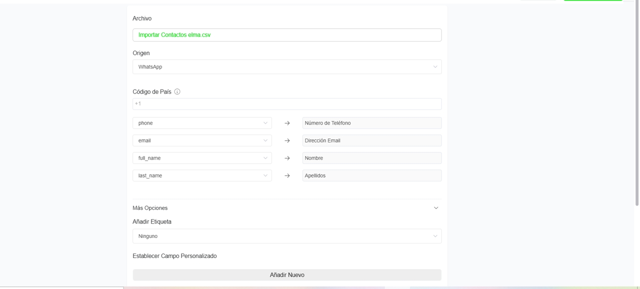 Para importar contactos de WhatsApp o de SMS, configura la fuente como ‘Contactos de WhatsApp’ o ‘Teléfono’ (para SMS), selecciona el código de país y sube un archivo .csv o .xlsx. La opción ‘Más opciones’ te permite crear un campo personalizado o asignar una etiqueta a los contactos.