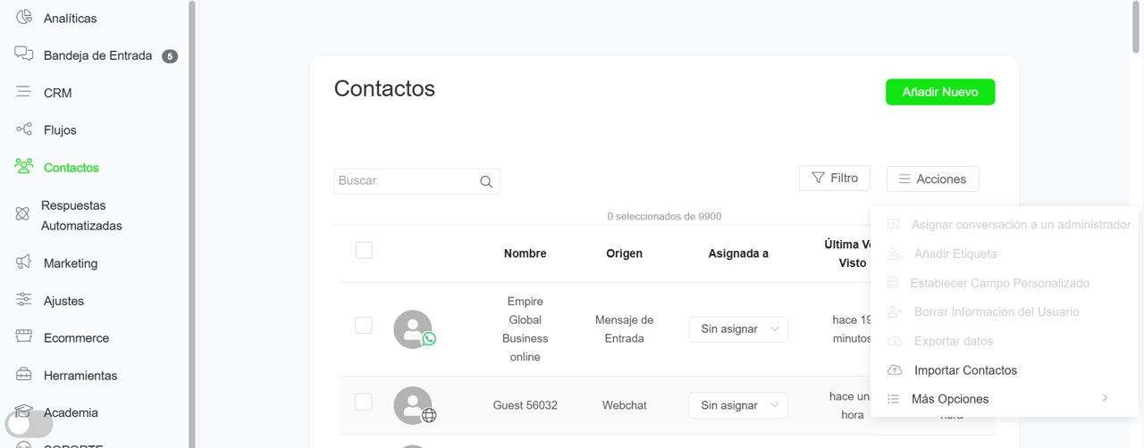 Si deseas importar contactos desde Manychat, elige Manychat como origen.